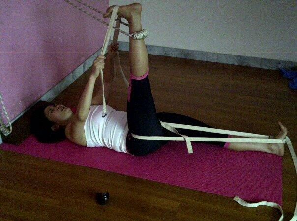 Suptha Padanghustasana dengan belt. Tapi pose ini umumnya sulit sekali dilakukan oleh pemakai high heels kelas rutin